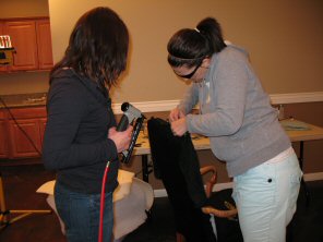 Jennifer and Randy working together to mold Ultra Suede fabric to the arm of the chair |